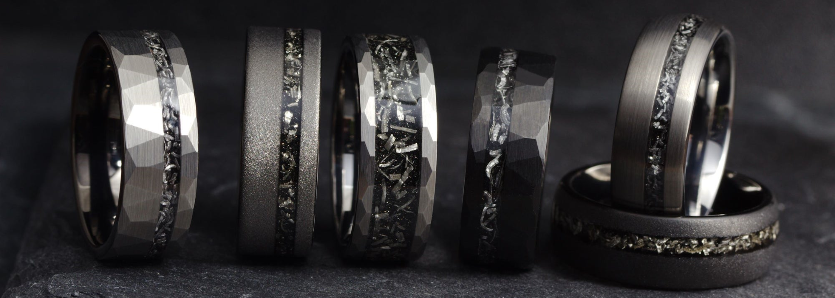 Meteorite rings are unique and crafted from genuine fragments of meteorites. They offer a distinctive look and feel, perfect for guys who want a ring with a story.