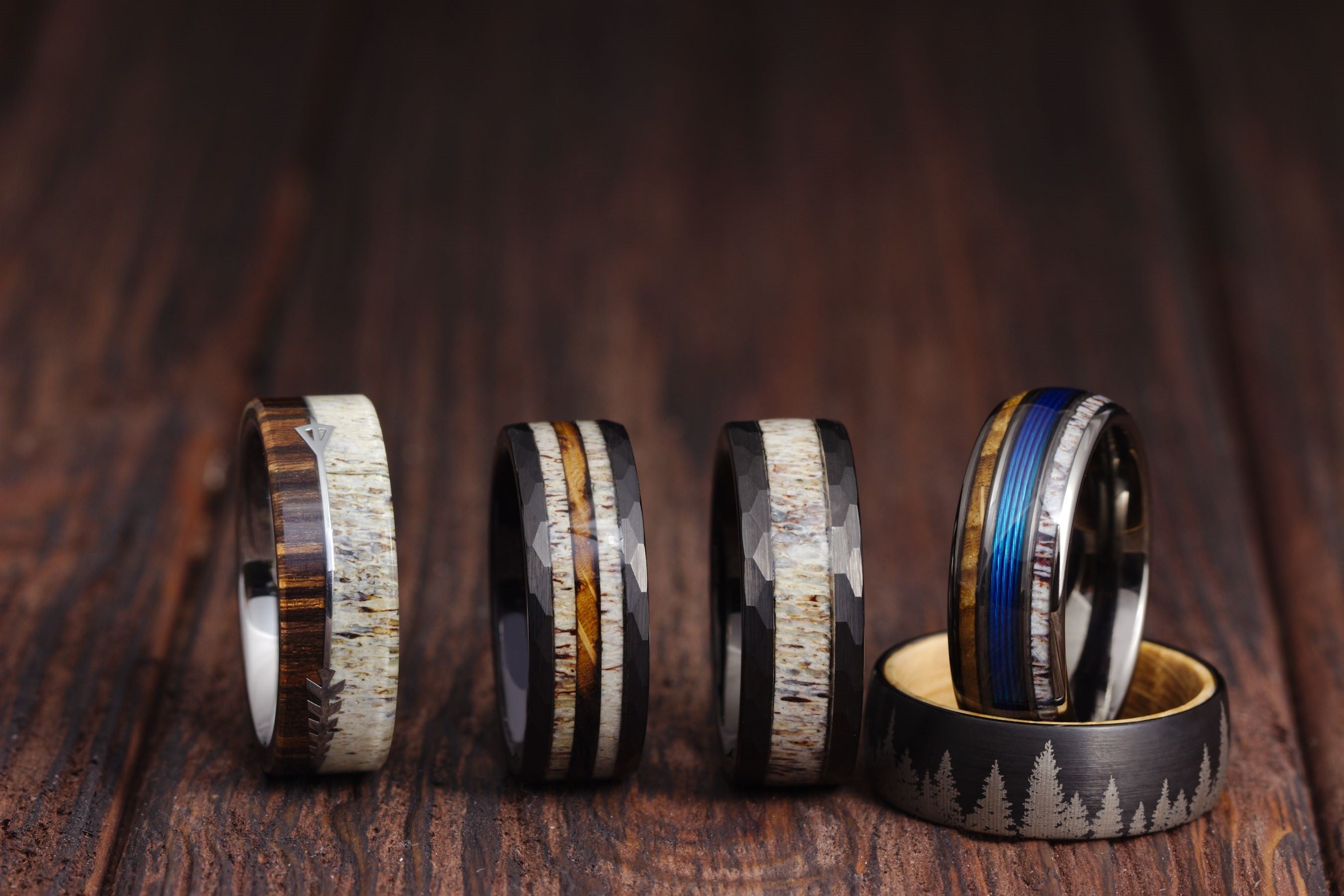 Choosing the right wedding band or ring is an important decision for any groom or gift giver looking for a ring for the man in their life. From tungsten rings to titanium wedding bands, the options are as diverse as the individuals who wear them. Many people prefer men’s tungsten wedding bands for their durability and scratch resistance, while others gravitate toward meteorite wedding bands for their unique and celestial designs. Whether you're just exploring manly rings, whiskey barrel wedding bands, or deer antler rings, there's something to suit every style and personality.
