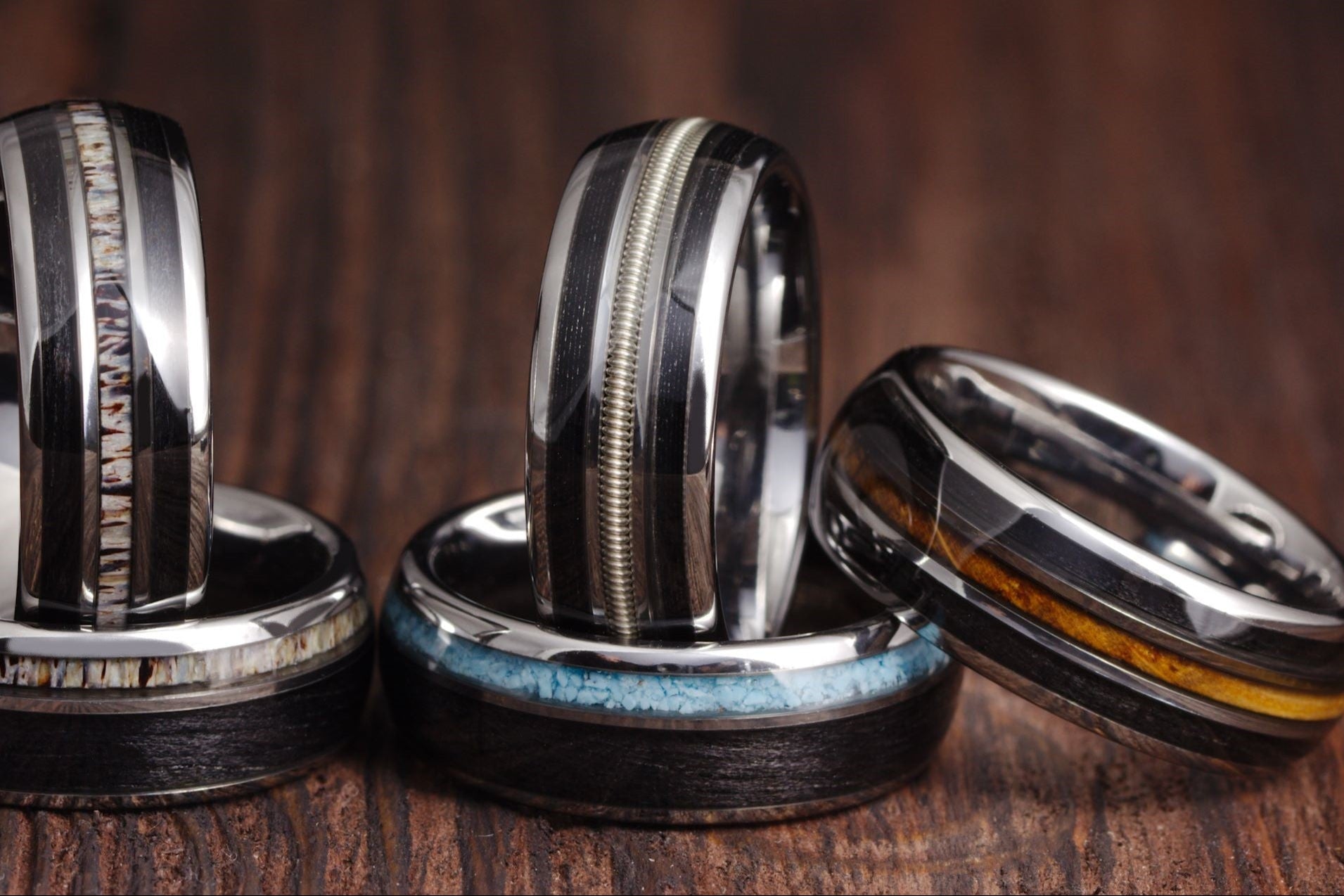At Gentlemen’s Bands, we create extraordinary rings for extraordinary men. Our designs are handcrafted from rare materials you won’t find at your local jeweler — think genuine dinosaur bone, authentic meteorite, reclaimed whiskey barrel wood, guitar string, deer antler, tungsten, titanium, and other remarkable elements sourced from around the globe.
